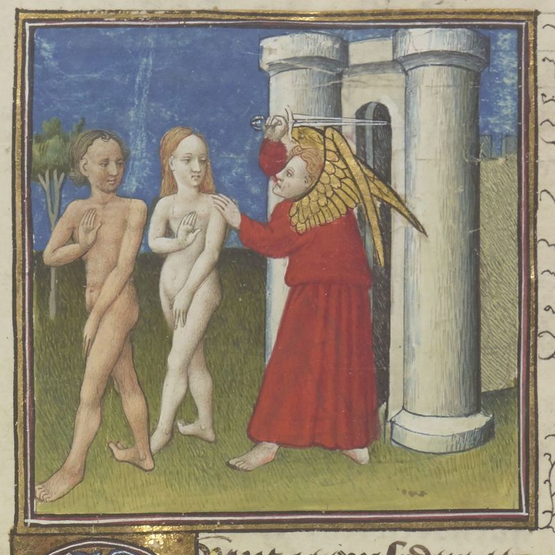 Parigi, Bibliothèque Nationale de France, Fr. 229, f. 3r. Il copista del manoscritto è Boniface de Remenant. Adamo ed Eva vengono cacciati dal Paradiso Terrestre da un angelo con la spada sguainata.