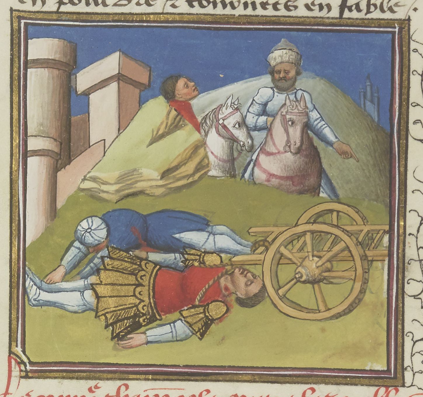 Parigi, Bibliothèque Nationale de France, Fr. 229, f. 32r. Il copista del manoscritto è Boniface de Remenant. Accanto ad un carro giacciono i corpi di Ettore e Paride.