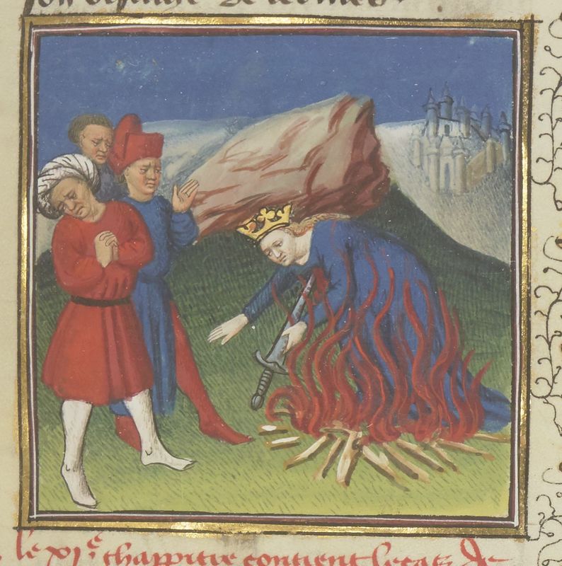 Parigi, Bibliothèque Nationale de France, Fr. 229, f. 56r. Il copista del manoscritto è Boniface de Remenant. Il popolo dolente assiste al suicidio di Didone, che si trafigge con la spada gettandosi sulla pira funebre.
