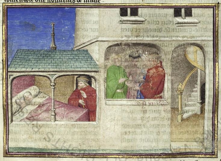 Città del Vaticano, Biblioteca Apostolica Vaticana, Pal. lat. 1989, f. 161r. Il copista del manoscritto, datato 15 giugno 1414, è Laurent de Premierfait. Lizio da Valbona sorprende la figlia Caterina a letto con l'amante Ricciardi; Lizio acconsente al matrimonio della coppia.