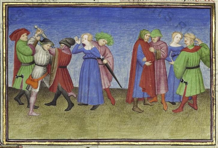 Città del Vaticano, Biblioteca Apostolica Vaticana, Pal. lat. 1989, f. 163v. Il copista del manoscritto, datato 15 giugno 1414, è Laurent de Premierfait. Giannole e Minghino tentano di rapire Agnesa, facendo scoppiare una rissa; Giannole scopre di essere il fratello di Agnesa, la quale sposa Minghino.
