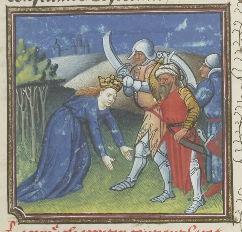 Parigi, Bibliothèque Nationale de France, Fr. 229, f. 154v. Il copista del manoscritto è Boniface de Remenant. Olimpiade, madre di Alessandro Magno, viene giustiziata.