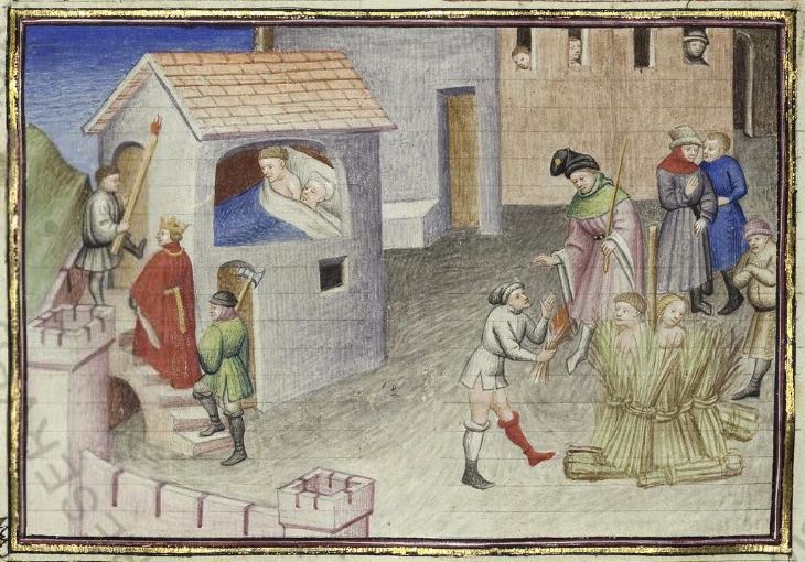 Maestro della Cité des Dames (1414-1419), Gianni di Procida e Restituta vengono scoperti dal re Federigo; i due amanti vengono condannati al rogo