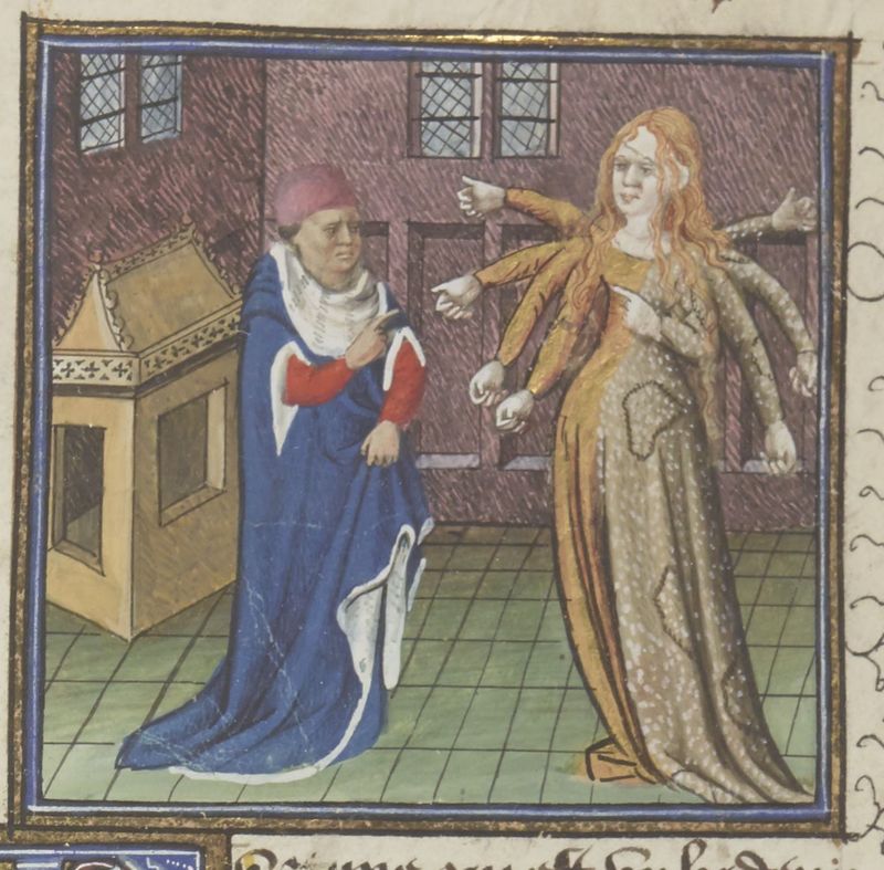 Parigi, Bibliothèque Nationale de France, Fr. 229, f. 221r. Il copista del manoscritto è Boniface de Remenant. La Fortuna, rappresentata come una dama con otto braccia, appare a Giovanni Boccaccio.