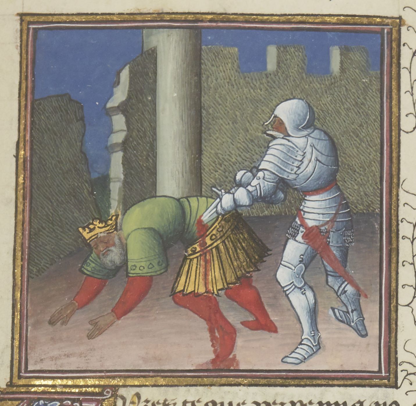 Parigi, Bibliothèque Nationale de France, Fr. 229, f. 233r. Il copista del manoscritto è Boniface de Remenant. Mitridate, re del Ponto, si fa uccidere da un generale dei Galli.