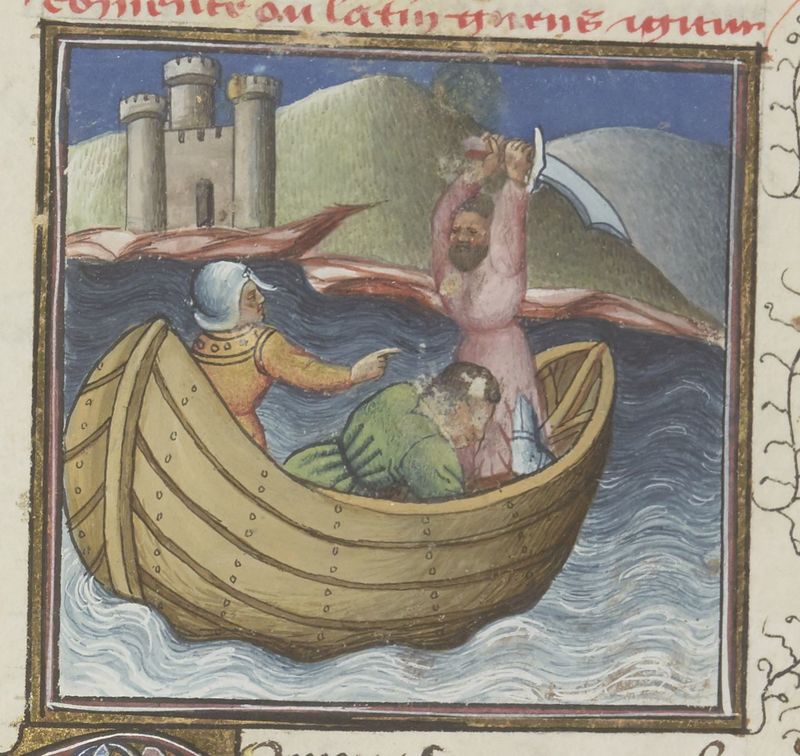 Parigi, Bibliothèque Nationale de France, Fr. 229, f. 243r. Il copista del manoscritto è Boniface de Remenant. Due soldati di Tolomeo decapitano Pompeo su una nave.