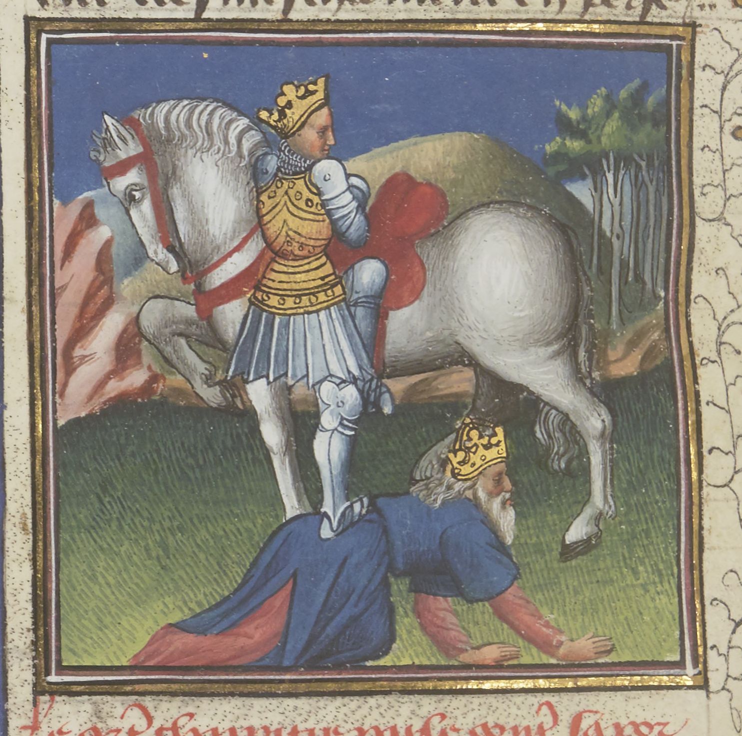 Maestro del Roman de la Rose di Vienna (1435-1440), Sapore monta a cavallo usando la schiena di Valeriano come predellino