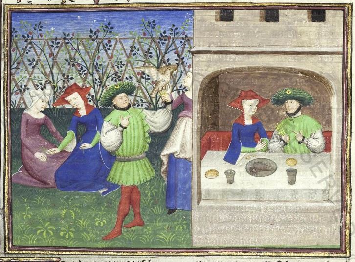 Città del Vaticano, Biblioteca Apostolica Vaticana, Pal. lat. 1989, f. 174v. Il copista del manoscritto, datato 15 giugno 1414, è Laurent de Premierfait. Federigo degli Alberighi mostra a monna Giovanna e un'altra donna il proprio falcone; Federigo serve il falcone come pietanza a Giovanna, mostrandole le zampe dell'animale.