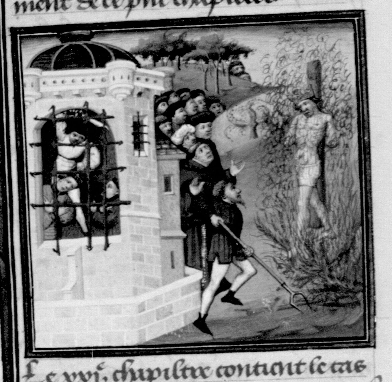 Parigi, Bibliothèque Nationale de France, Fr. 235, f. 76v. Il figlio di Creso interviene per salvare la vita del padre, che sta per essere decapitato da un soldato persiano; Creso viene legato ad un palo e dato alle fiamme.