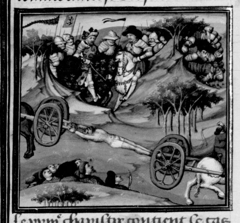 Parigi, Bibliothèque Nationale de France, Fr. 235, f. 81v. Mezio Fufezio viene legato tra due carri per essere squartato; sullo sfondo due eserciti si fronteggiano.