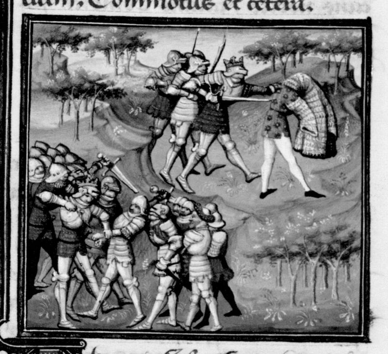 Parigi, Bibliothèque Nationale de France, Fr. 235, f. 108r. Artabano taglia la mano a Serse (?); Artaserse colpisce Artabano alle spalle mentre questi si sfila la cotta di maglia.