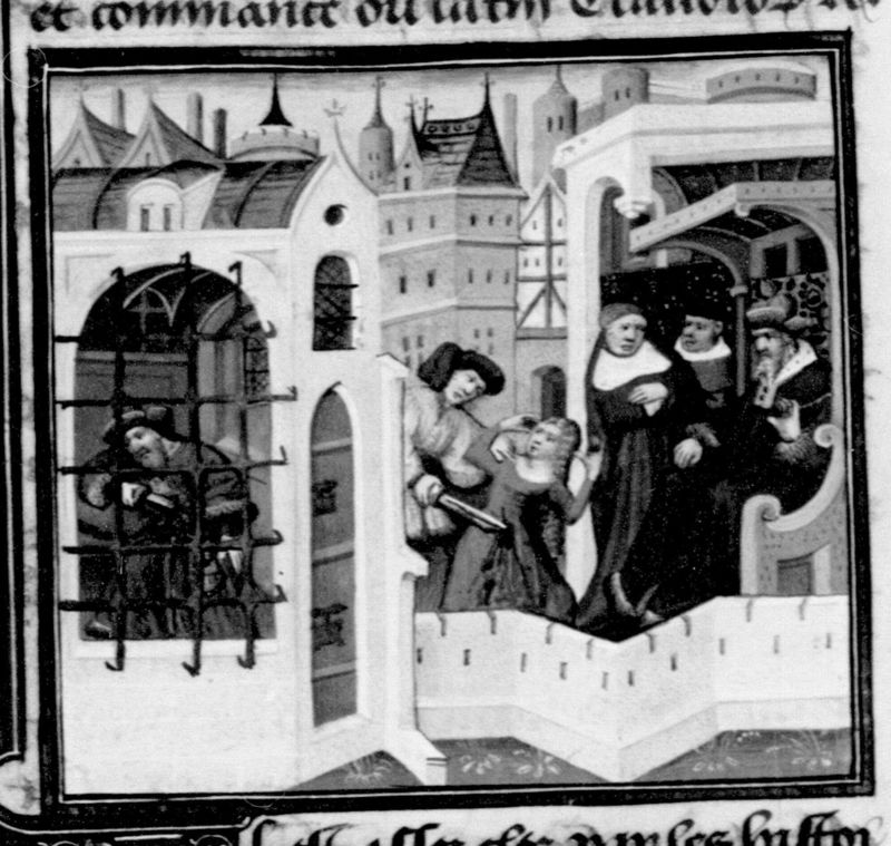 Parigi, Bibliothèque Nationale de France, Fr. 235, f. 110v. Virginio uccide la figlia Virginia per sottrarla alla schiavitù; Appio Claudio si uccide in prigione.