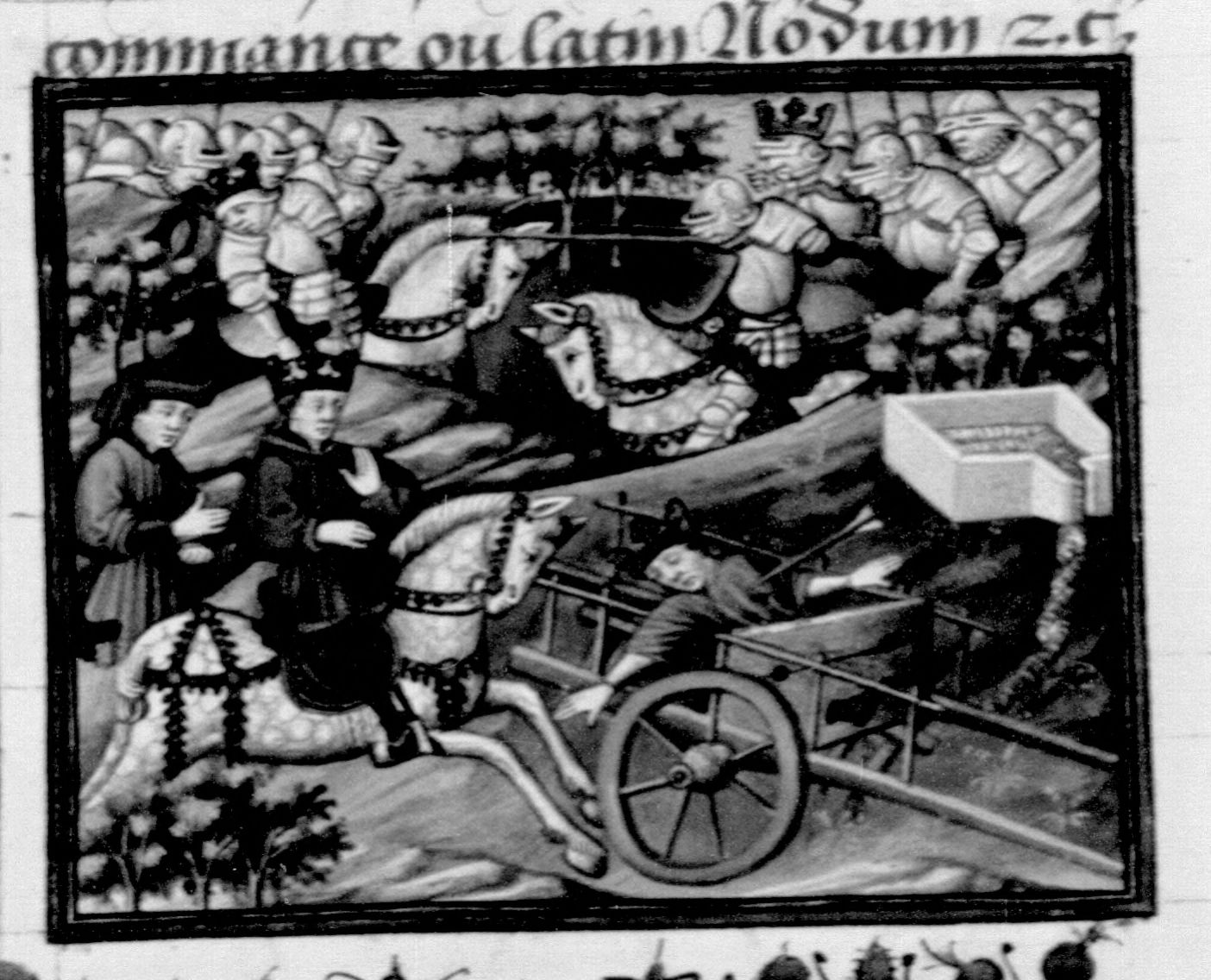 Parigi, Bibliothèque Nationale de France, Fr. 235, f. 146v. Dario, re di Persia, viene colpito a morte da un dardo mentre si trova prigioniero in ceppi su un carro; l'esercito macedone guidato da Alessandro sconfigge l'esercito persiano.