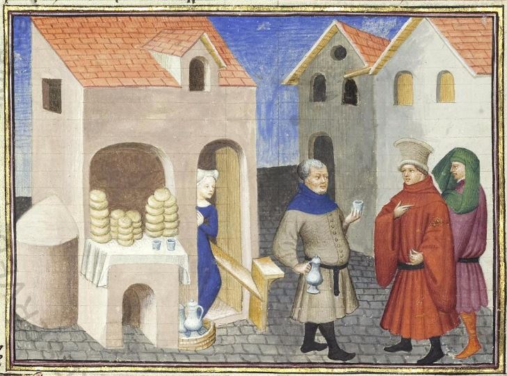 Città del Vaticano, Biblioteca Apostolica Vaticana, Pal. lat. 1989, f. 184r. Il copista del manoscritto, datato 15 giugno 1414, è Laurent de Premierfait. Il fornaio Cisti offre il suo vino a messer Geri Spina e all'ambasciatore del Papa.
