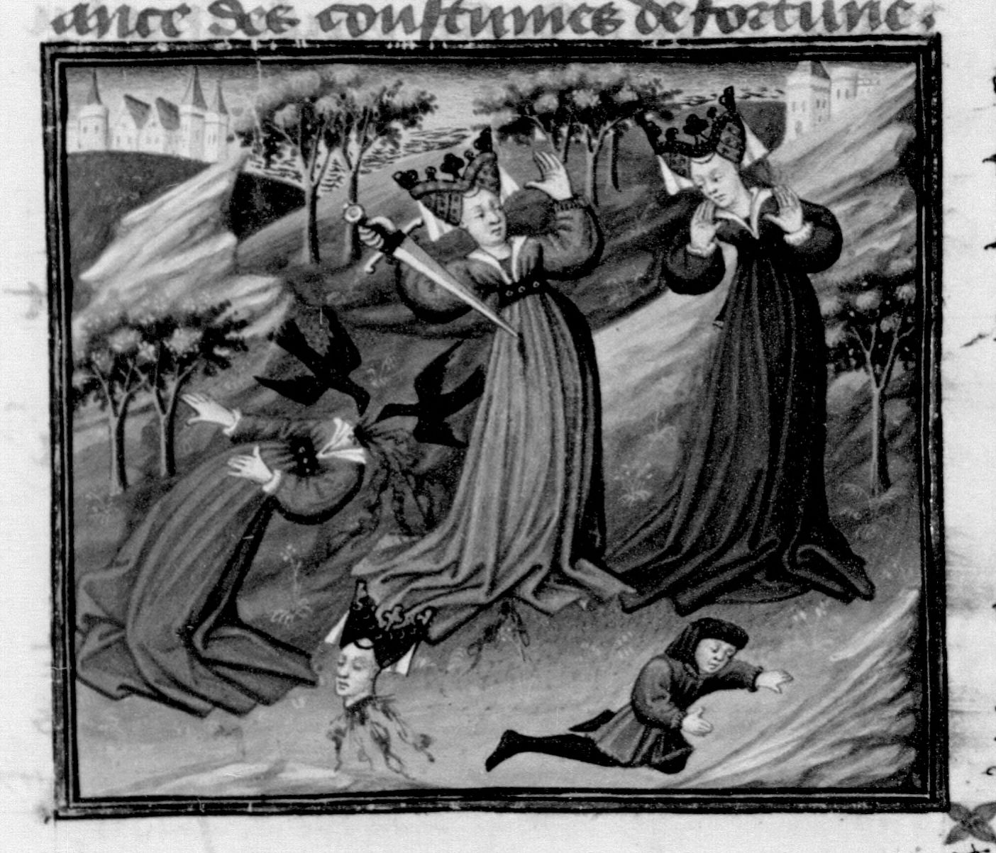 Parigi, Bibliothèque Nationale de France, Fr. 235, f. 155r. La regina Olimpiade decapitata e il suicidio di Cleopatra Euridice.