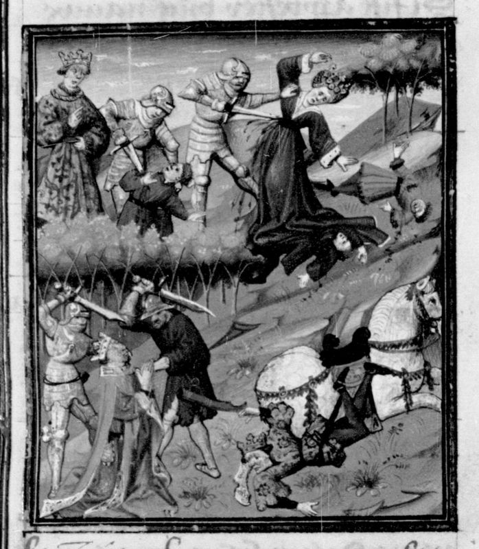 Parigi, Bibliothèque Nationale de France, Fr. 236, f. 1r. Seleuco ordina ad un sicario di uccidere Beronice e i suoi figli; Antioco viene assassinato dai banditi; Seleuco cade da cavallo.