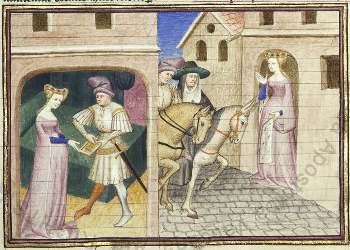 Città del Vaticano, Biblioteca Apostolica Vaticana, Pal. lat. 1989, f. 185v. Il copista del manoscritto, datato 15 giugno 1414, è Laurent de Premierfait. Nonna de' Pulci riceve 500 fiorini falsi da messer Diego Della Ratta; la donna motteggia il vescovo Antonio d'Orso e messer Della Ratta.