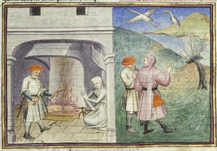 Maestro della Cité des Dames (1414-1419), Chichibio offre una coscia della gru a Brunetta; Chichibio e Currado osservano le gru