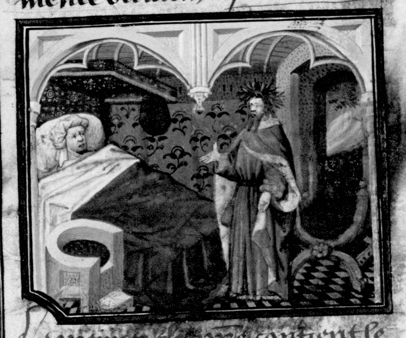 Parigi, Bibliothèque Nationale de France, Fr. 236, f. 134v. Francesco Petrarca appare in sogno a Giovanni Boccaccio.