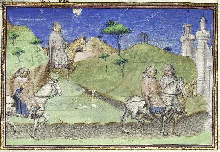 Città del Vaticano, Biblioteca Apostolica Vaticana, Pal. lat. 1989, f. 188v. Il copista del manoscritto, datato 15 giugno 1414, è Laurent de Premierfait. Forese da Rabatta e Giotto percorrono la strada del Mugello a cavallo; i due uomini giungono alle porte di Firenze.