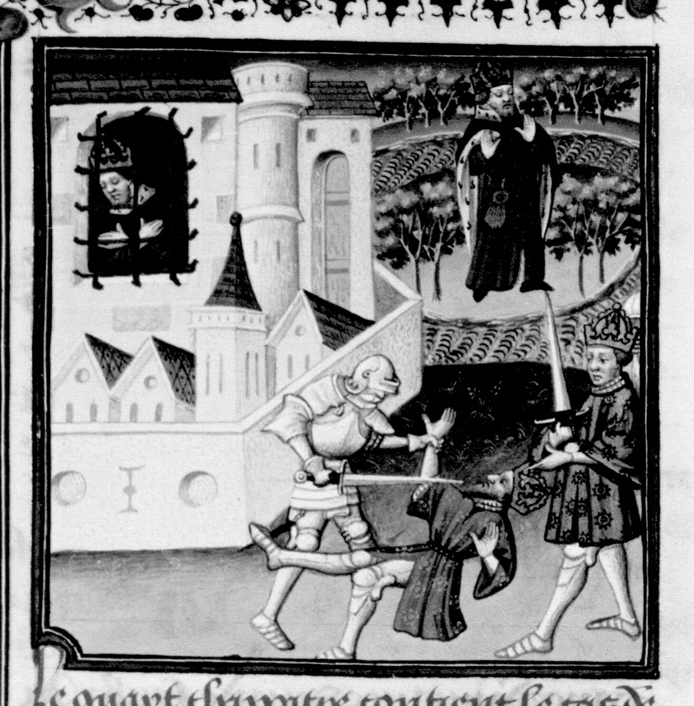 Parigi, Bibliothèque Nationale de France, Fr. 236, f. 195r. L'imperatore Giustiniano II viene condannato all'esilio; Leonzio viene messo in prigione; Tiberio III viene assassinato.
