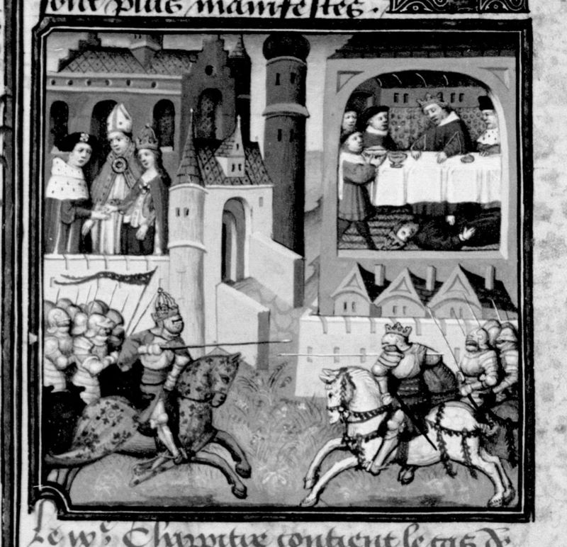 Parigi, Bibliothèque Nationale de France, Fr. 236, f. 203r. Il matrimonio di Diogene il Romano, imperatore d'Oriente; gli eserciti di Diogene e di Belzet si affrontano in battaglia; Belzet utilizza Diogene come poggiapiedi durante un banchetto.