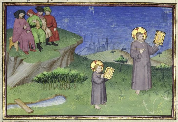 Città del Vaticano, Biblioteca Apostolica Vaticana, Pal. lat. 1989, f. 189v. Il copista del manoscritto, datato 15 giugno 1414, è Laurent de Premierfait. Michele Scalza discute con i suoi amici sulla collina di Montughi; Dio bambino impara a disegnare; Dio adulto mostra un disegno compiuto.