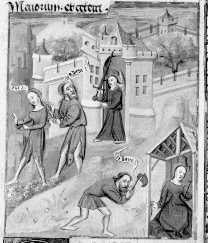 Parigi, Bibliothèque Nationale de France, Fr. 232, f. 2v. Adamo ed Eva vengono cacciati dal Paradiso Terrestre da un angelo con la spada sguainata; Adamo zappa la terra mentre Eva tesse.