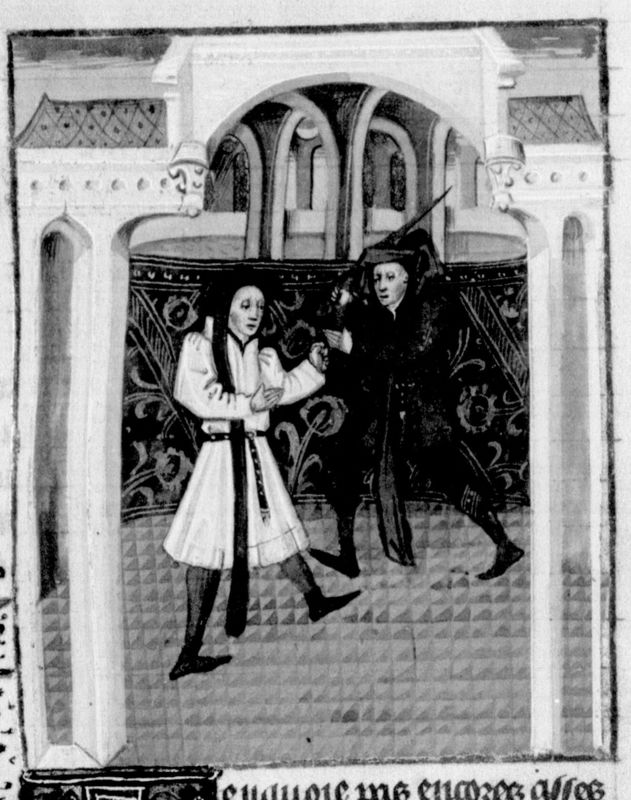 Parigi, Bibliothèque Nationale de France, Fr. 232, f. 33v. Oreste uccide Neottolemo (Pirro), figlio di Achille.