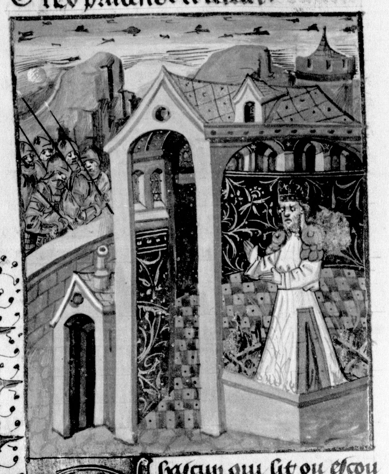 Parigi, Bibliothèque Nationale de France, Fr. 232, f. 51v. Sardanapalo si getta nel rogo del palazzo con i suoi tesori; all'esterno delle mura si trova l'esercito degli assedianti.