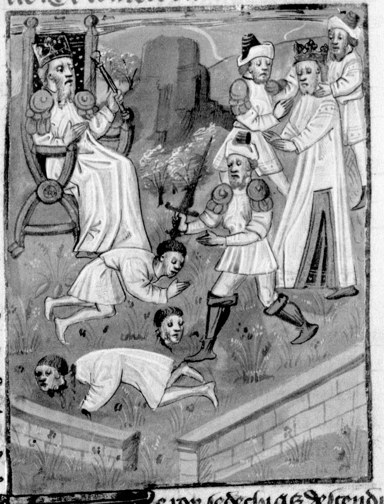Parigi, Bibliothèque Nationale de France, Fr. 232, f. 54v. Nabucodonosor fa massacrare i figli di Sedecia sotto gli occhi del padre.