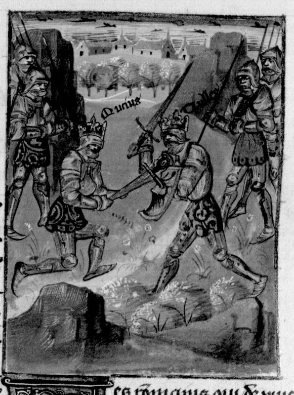 Parigi, Bibliothèque Nationale de France, Fr. 232, f. 67r. Lo scontro tra Tullo Ostilio e Mezio Fufezio (?).