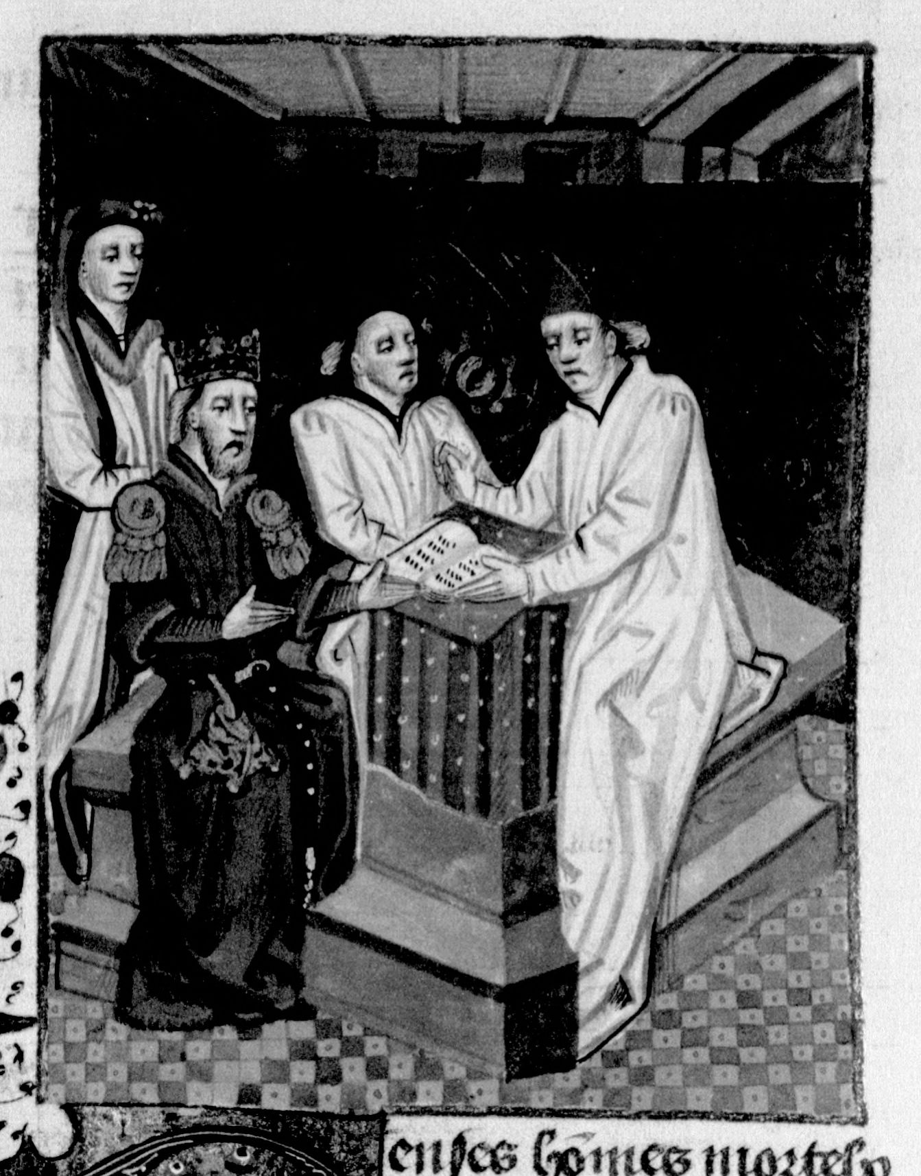 Parigi, Bibliothèque Nationale de France, Fr. 232, f. 89r. L'autore Giovanni Boccaccio mostra un libro ad alcuni uomini.