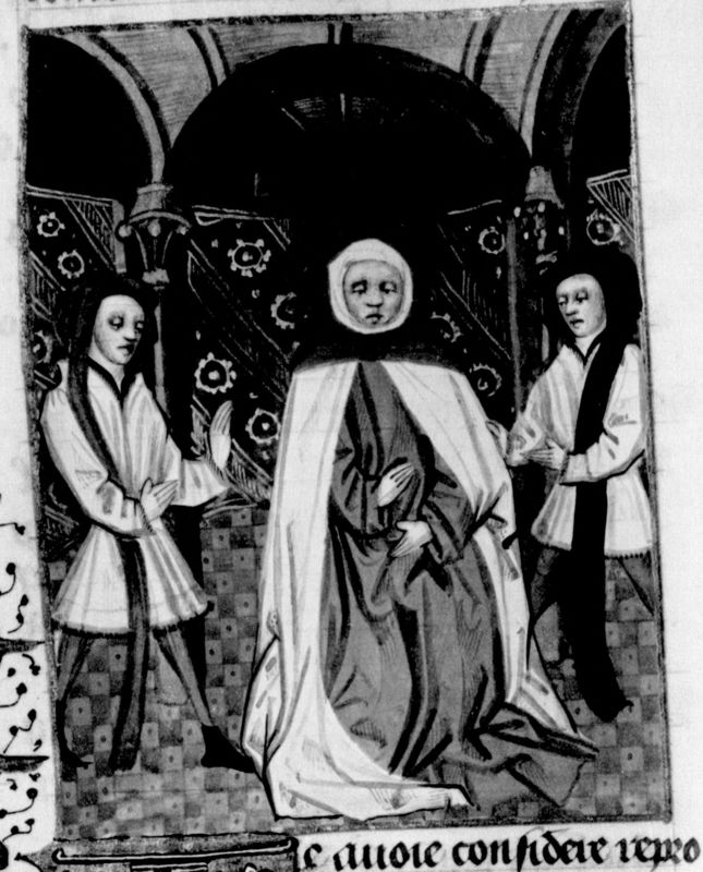 Parigi, Bibliothèque Nationale de France, Fr. 232, f. 95v. L'autore Giovanni Boccaccio siede fiancheggiato da due uomini.