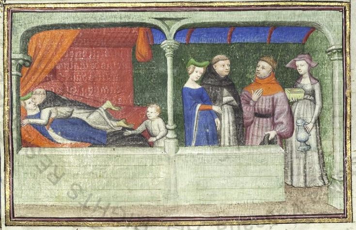Città del Vaticano, Biblioteca Apostolica Vaticana, Pal. lat. 1989, f. 205r. Il copista del manoscritto, datato 15 giugno 1414, è Laurent de Premierfait. Frate Rinaldo giace con la madre del proprio figlioccio; il frate viene ricompensato dal marito della donna per la presunta guarigione del bambino.