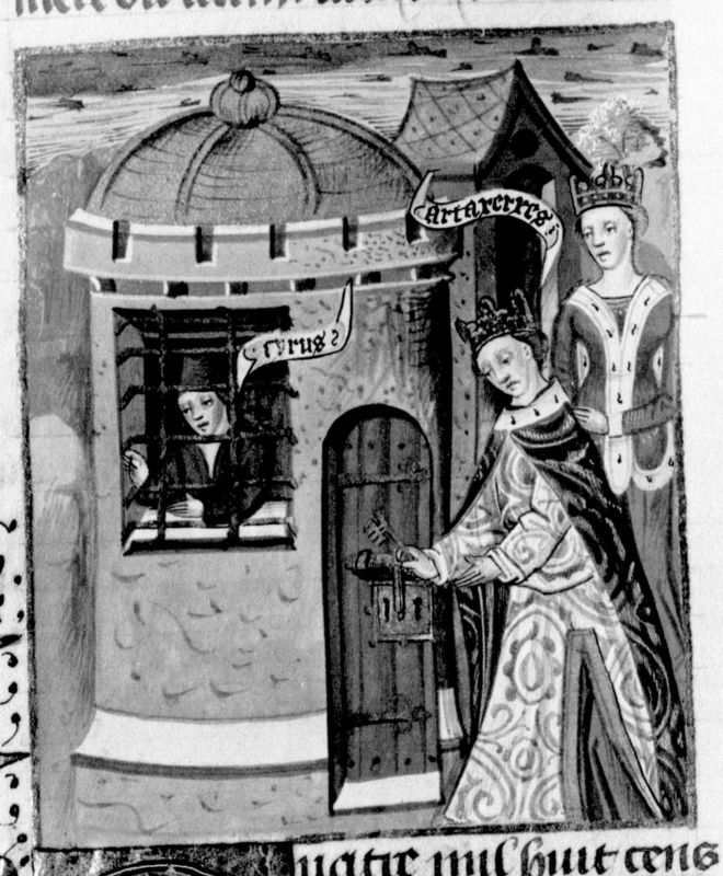 Parigi, Bibliothèque Nationale de France, Fr. 232, f. 110v. Consigliato dalla madre Parisatide, Artaserse II perdona il fratello Ciro il Giovane e lo libera dalla prigione.