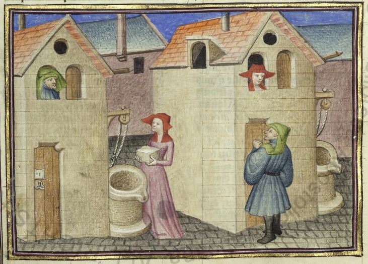 Maestro della Cité des Dames (1414-1419), Ghita getta una pietra nel pozzo; Tofano viene chiuso fuori casa