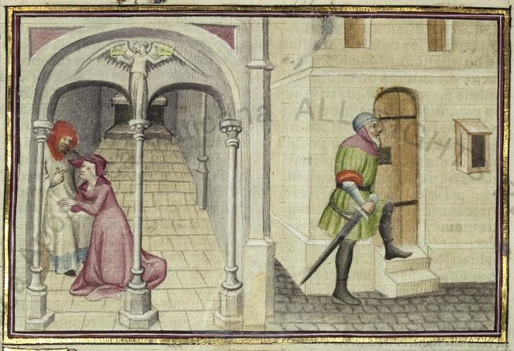 Città del Vaticano, Biblioteca Apostolica Vaticana, Pal. lat. 1989, f. 210r. Il copista del manoscritto, datato 15 giugno 1414, è Laurent de Premierfait. Arimino, travestito da prete, ascolta la confessione della moglie; di notte l'uomo monta la guardia davanti alla porta di casa.
