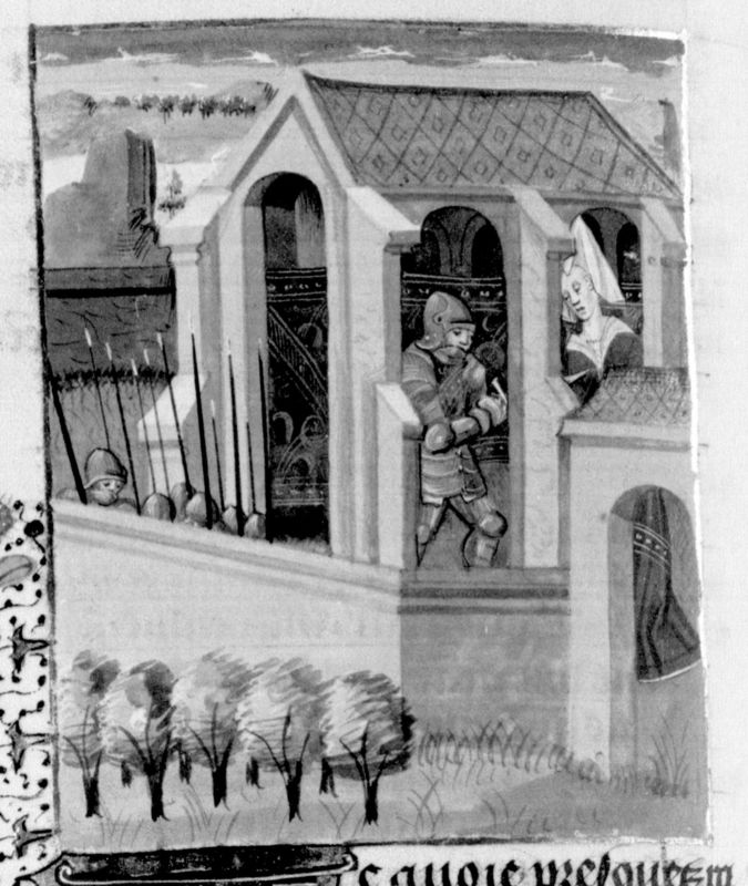 Parigi, Bibliothèque Nationale de France, Fr. 232, f. 157v. Deidamia, rifugiatasi nel tempio di Diana, viene raggiunta da Milone e uccisa.