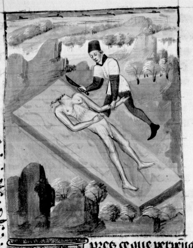 Parigi, Bibliothèque Nationale de France, Fr. 232, f. 206v. La morte di Mitridate (modello mal compreso: è rappresentato un uomo che fa a pezzi un cadavere).