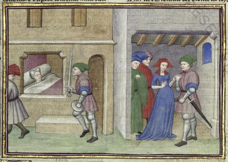 Città del Vaticano, Biblioteca Apostolica Vaticana, Pal. lat. 1989, f. 217v. Il copista del manoscritto, datato 15 giugno 1414, è Laurent de Premierfait. Arriguccio insegue Ruberto fuori la camera da letto dove dorme la moglie; la moglie di Arriguccio accusa il marito davanti ai suoi fratelli.
