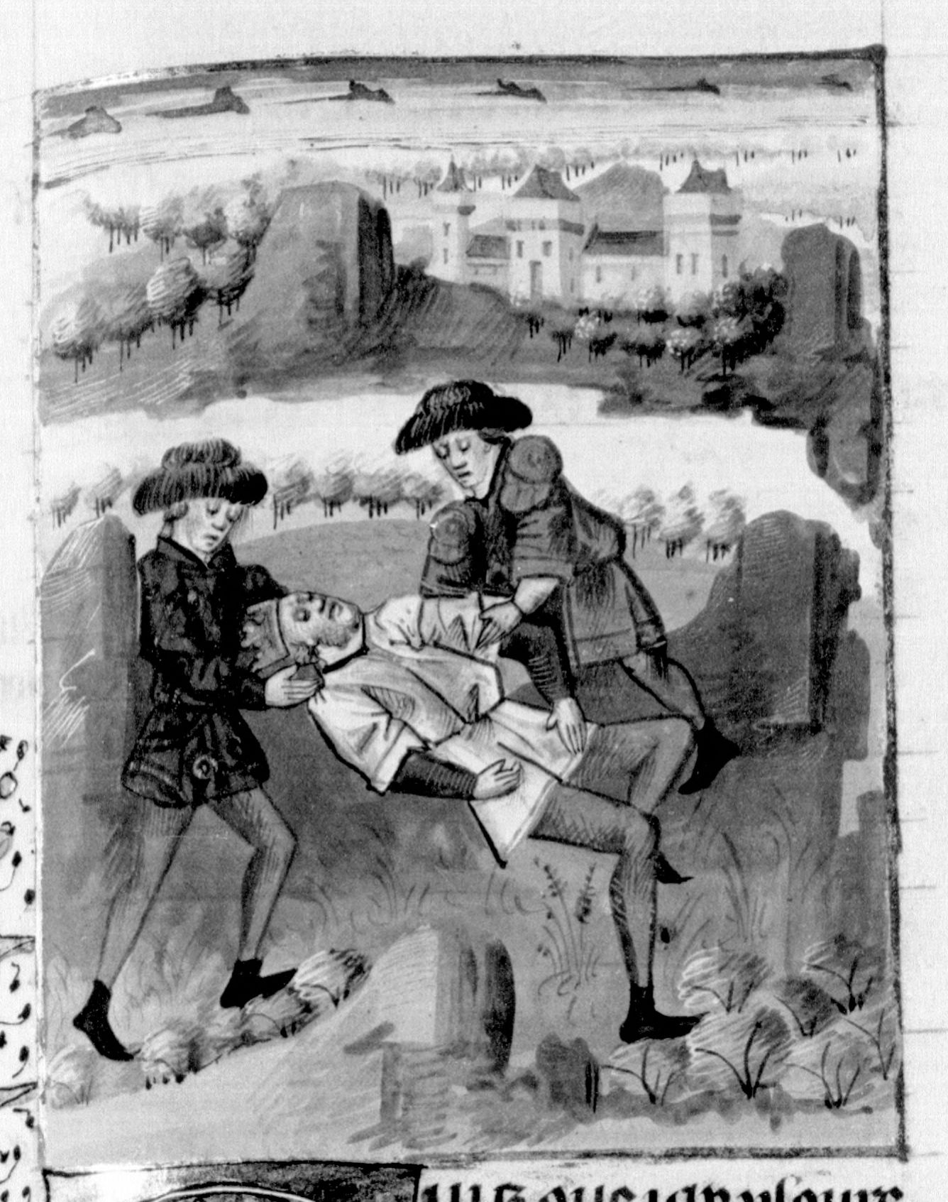 Parigi, Bibliothèque Nationale de France, Fr. 232, f. 223r. Due uomini trasportano il cadavere di un re.