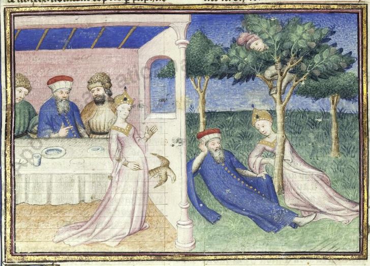 Città del Vaticano, Biblioteca Apostolica Vaticana, Pal. lat. 1989, f. 221r. Il copista del manoscritto, datato 15 giugno 1414, è Laurent de Premierfait. Lidia uccide lo sparviero di suo marito Nicostrato durante un banchetto; Lidia e Nicostrato conversano distesi in un prato, mentre Pirro è nascosto tra i rami di un pero.