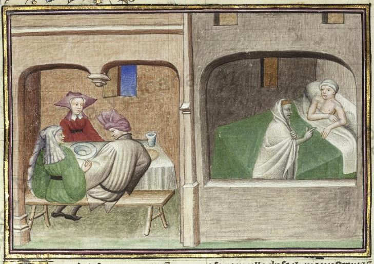Città del Vaticano, Biblioteca Apostolica Vaticana, Pal. lat. 1989, f. 226r. Il copista del manoscritto, datato 15 giugno 1414, è Laurent de Premierfait. I due amici Tingoccio e Meuccio siedono a tavola con monna Mita; dopo esser morto, Tingoccio appare a Meuccio nella sua stanza.