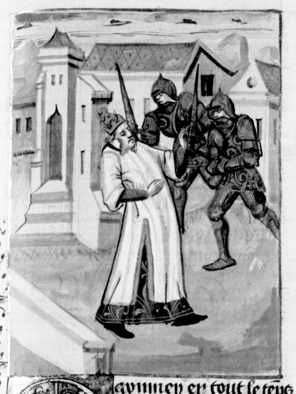 Parigi, Bibliothèque Nationale de France, Fr. 232, f. 281r. Massimiano Erculeo viene catturato a Marsiglia dai soldati di Costantino.