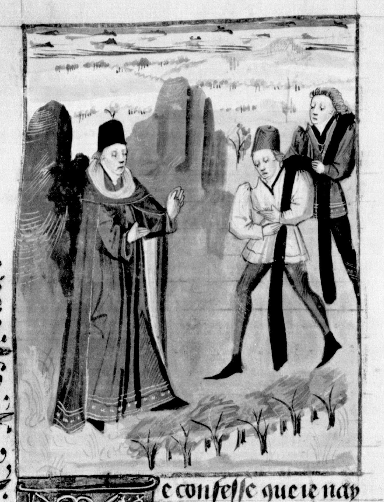 Parigi, Bibliothèque Nationale de France, Fr. 232, f. 288v. Giovanni Boccaccio incontra due uomini.