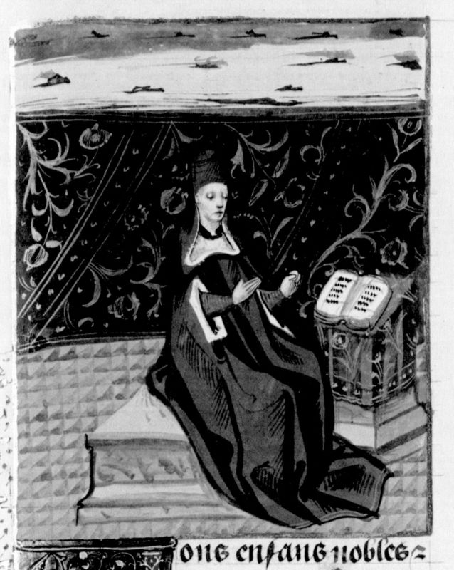 Parigi, Bibliothèque Nationale de France, Fr. 232, f. 303r. L'autore Giovanni Boccaccio siede dinanzi a un leggio, sul quale è posato un libro aperto.