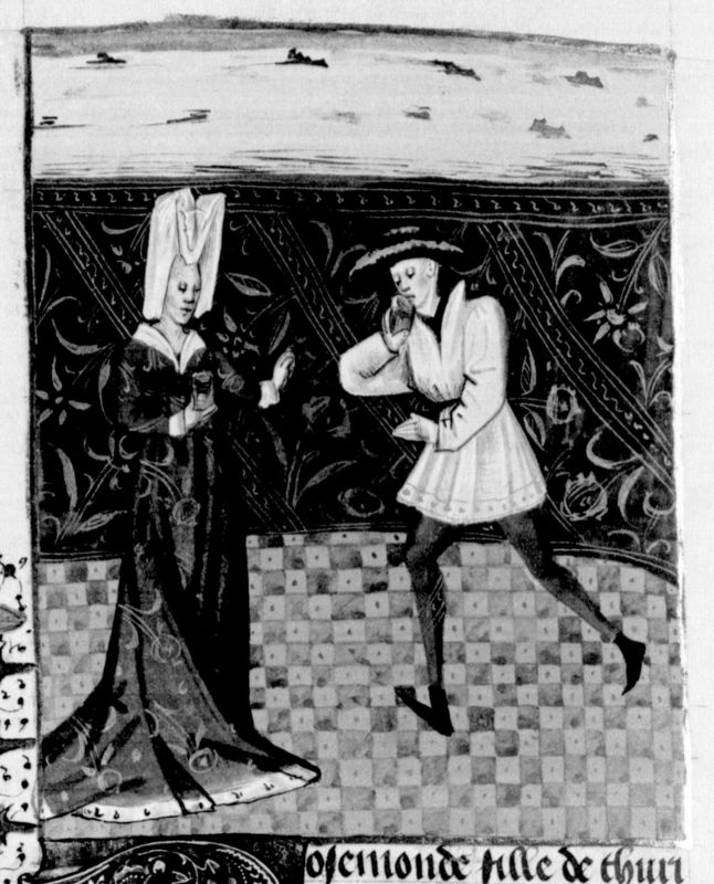 Parigi, Bibliothèque Nationale de France, Fr. 232, f. 304v. La regina Rosmunda e lo scudiero Elmichi bevono due coppe di vino avvelenato.