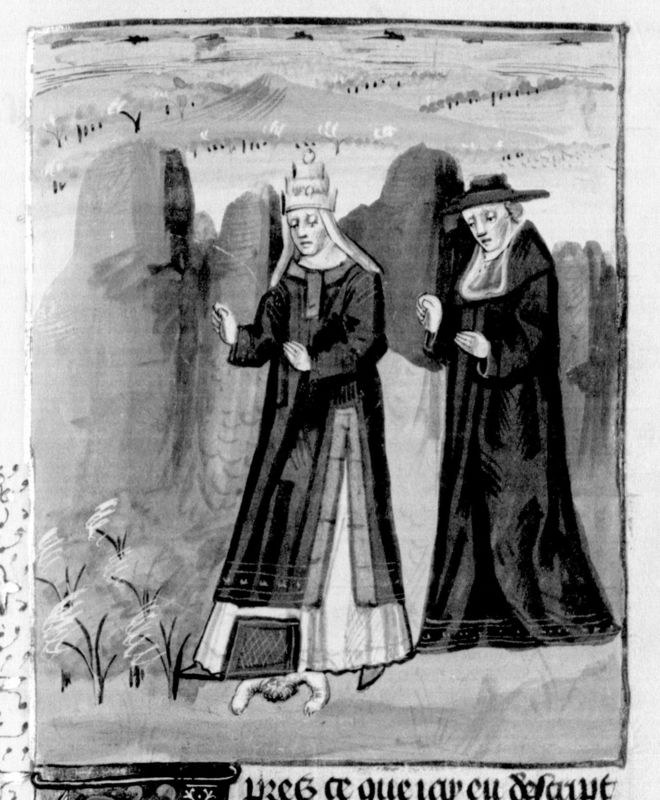 Parigi, Bibliothèque Nationale de France, Fr. 232, f. 319r. La papessa Giovanna dà alla luce un bambino durante una processione religiosa.