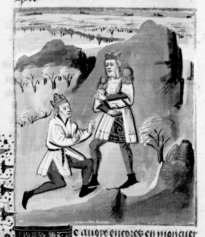 Parigi, Bibliothèque Nationale de France, Fr. 232, f. 328r. Riccardo I d'Inghilterra concede a Guido di Lusignano di partire per Cipro.